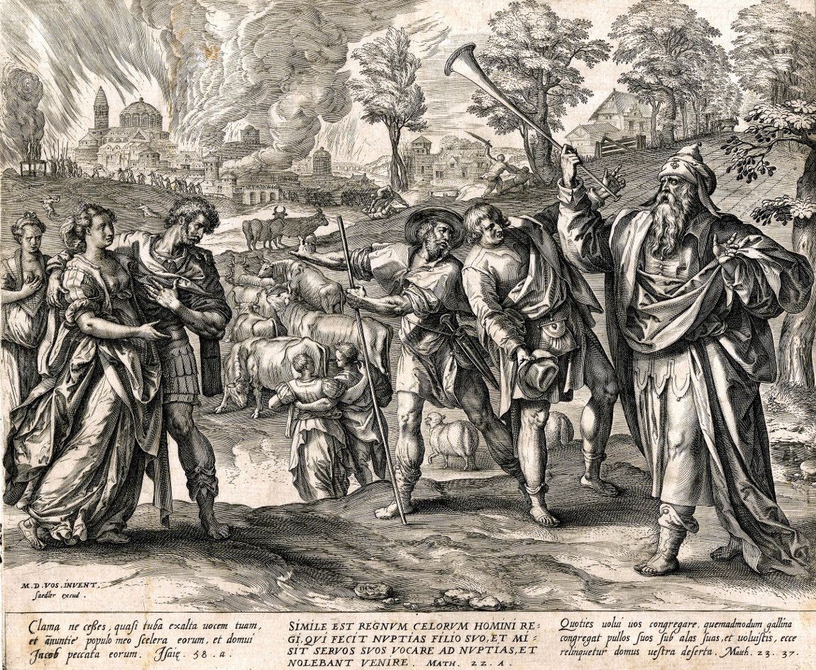 Les illustrations de cette première gravure sont inspirées de la parabole des noces du fils du roi (Matthieu 22.1-14) qui commence par ces mots : le royaume des cieux est semblable à un roi qui fit des noces pour son fils (Matthieu 22.2). Le roi apparaît au premier plan une trompette à la main. Au centre de l’image, un couple se tenant bras dessus, bras dessous, sans doute le fils du roi et son épouse.