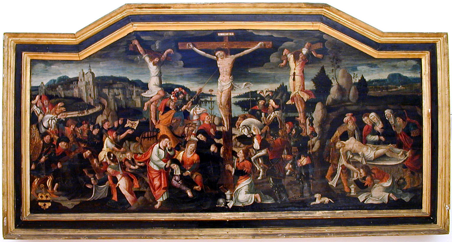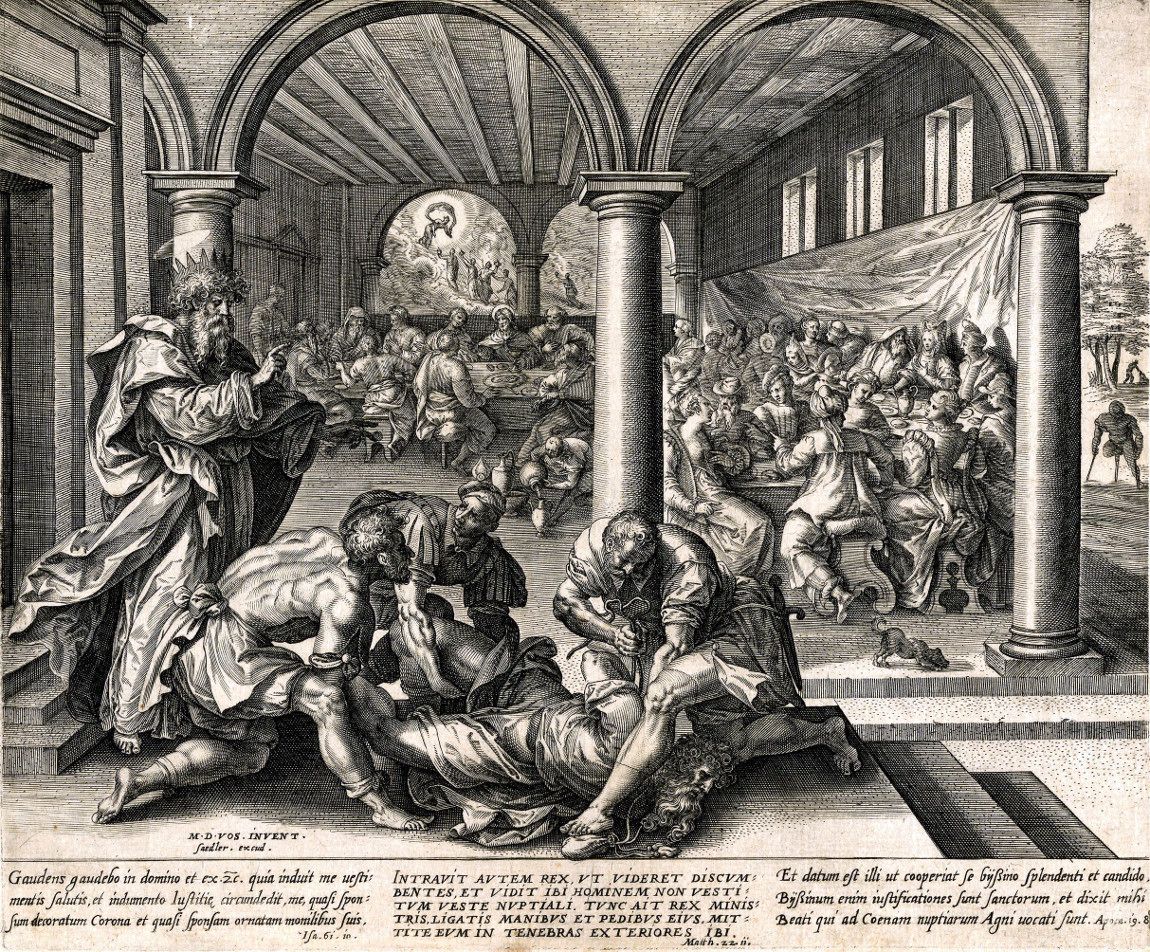 Le premier plan de cette seconde gravure est une représentation des versets 11 à 14 : Le roi entra pour voir ceux qui étaient à table, et il aperçut là un homme qui n’avait pas revêtu un habit de noces. Il lui dit : Mon ami, comment es-tu entré ici sans avoir un habit de noces ? Cet homme eut la bouche fermée. 13 Alors le roi dit aux serviteurs : Liez-lui les pieds et les mains, et jetez-le dans les ténèbres du dehors, où il y aura des pleurs et des grincements de dents. 14 Car il y a beaucoup d’appelés, mais peu d’élus (Matthieu 22.11-14)