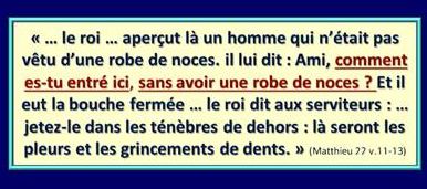Le premier plan de cette seconde gravure est une représentation des versets 11 à 14 : Le roi entra pour voir ceux qui étaient à table, et il aperçut là un homme qui n’avait pas revêtu un habit de noces. Il lui dit : Mon ami, comment es-tu entré ici sans avoir un habit de noces ? Cet homme eut la bouche fermée. 13 Alors le roi dit aux serviteurs : Liez-lui les pieds et les mains, et jetez-le dans les ténèbres du dehors, où il y aura des pleurs et des grincements de dents. 14 Car il y a beaucoup d’appelés, mais peu d’élus (Matthieu 22.11-14)