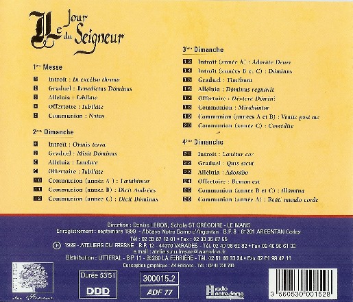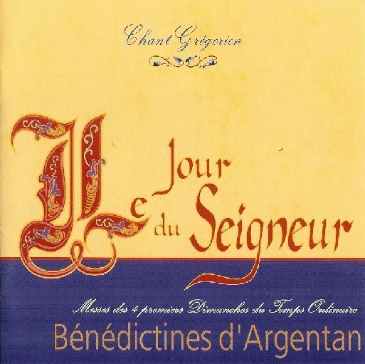 Nous avions écouté, la semaine passée, l’enregistrement historique issu d’un microsillon 33 T., édité par le label Decca en juillet 1971. Les moniales bénédictines de l’abbaye d’Argentan étaient dirigées par dom Joseph Gajard, en un de ses derniers enregistrements, avant son retour à Dieu, moins d’un an plus tard. Restons cette semaine avec les chantres de l’abbaye Notre-Dame d’Argentan et leur maître de chœur de l’abbaye de Solesmes pour l’émission avec commentaires mais écoutons les fichiers audio à l’adresse des choristes directement accessibles ci-dessus, dans la version plus récente que les bénédictines nous ont proposée en septembre 1999. Le disque s’intitule le Jour du Seigneur. Voici sa pochette ci-dessous. Notre regrettée amie Denise Lebon dirigeait les moniales…